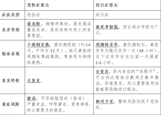 在感染人類的五種瘧原蟲中,危害最大的兩種瘧原蟲是惡性瘧原蟲與間日瘧原蟲,分別引起惡性瘧和間日瘧。